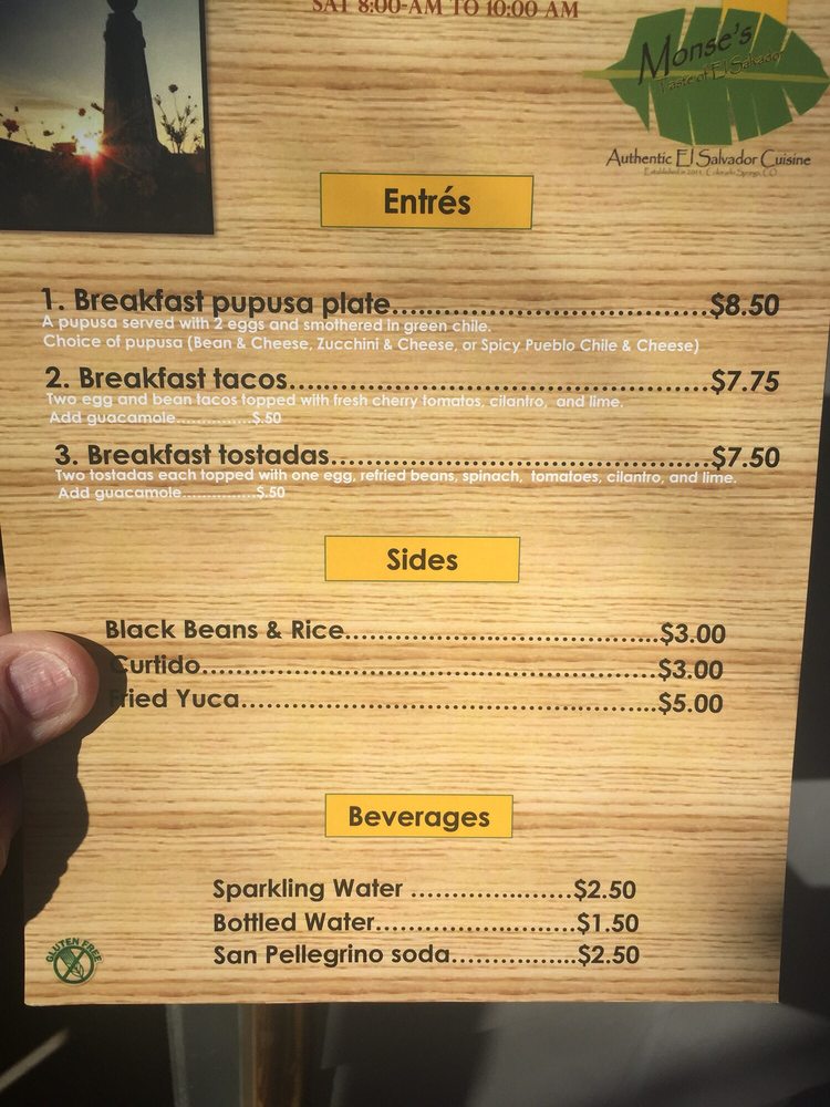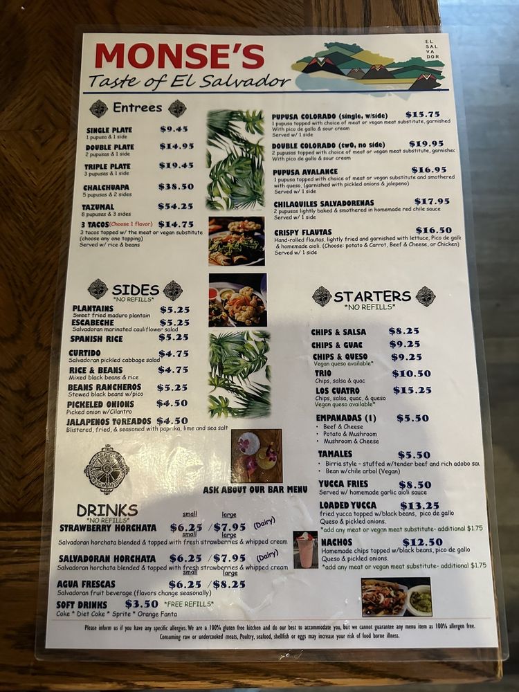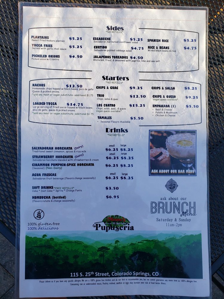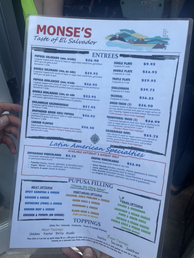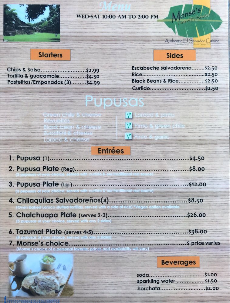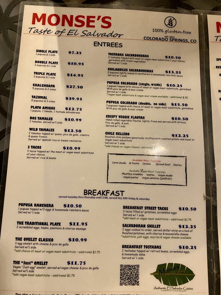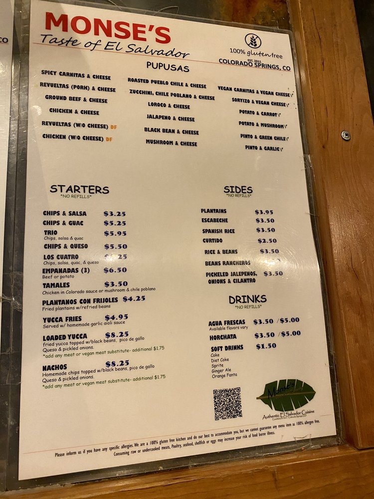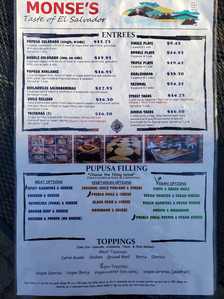 Monse's Pupuseria is a trendy Salvadoran restaurant in Colorado Springs offering gluten-free options, vegan dishes, and a wide variety of pupusas. The menu includes starters like chips and empanadas, as well as entrees ranging from single pupusas to large platters with multiple sides. Customers rave about the flavorful pupusas, especially the avalanche pupusas smothered in cheese. The atmosphere is described as hip and intimate, with vibrant decor and reggaeton music. The service is praised for its friendliness, although some reviews mention slightly slow wait times. Overall, Monse's is a must-visit for authentic Salvadoran cuisine in a relaxed setting. Don't miss out on their refreshing agua frescas and tasty horchatas!